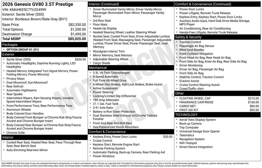 - Radio: AM/FM/HD Bang & Olufsen Sound System -inc: 1400 watts, 18 speakers, 14 channel amplifier, 27" integrated OLED instrument cluster and navigation system, SiriusXM Radio w/90-day subscription (not available in AK or HI), cloud connected platform (cloud profiles, connected routing, dynamic voice recognition, OTA updates), wireless Apple CarPlay, wireless Android Auto, Bluetooth® hands-free phone system w/audio streaming, wireless phone charger, Wi-Fi hotspot, steering wheel controls, USB and Genesis Connected Services