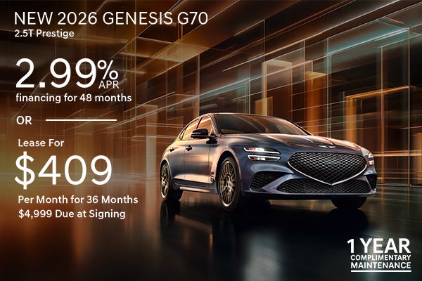 Ex. 2026 Genesis G70 2.5T Prestige. VIN: KMTG24SC1TU163388. MSRP: $50,320. Several in stock at similar pricing. APR offer: 2.99% APR financing for 48 months, subject to approved credit through Genesis Finance. Example: 2.99% APR for 48 months is $22.13 per $1,000 financed. Lease offer: $409 per month for 36 months with $4,999 due at signing; 10,000 miles per year, excess mileage fees may apply. One year of complimentary maintenance includes one oil change and one tire rotation. Good on select new and used vehicles. See the dealer for complete maintenance details. Advertised Price EXCLUDES all optional dealer offered items, accessories, or product addendums optionally selected by the purchaser, applicable official taxes and fees, and a $436 documentary fee. Offers expire 4/30/2026.