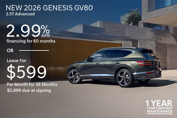 Ex. 2026 Genesis GV80 2.5T Advanced. VIN: KMUHBESB2TU331584. MSRP: $70,745. Several in stock at similar pricing. APR offer: 2.99% APR financing for 60 months, subject to approved credit through Genesis Finance. Example: 2.99% APR for 60 months is $17.96 per $1,000 financed. Lease offer: $599 per month for 36 months with $5,999 due at signing; 10,000 miles per year, excess mileage fees may apply. One year of complimentary maintenance includes one oil change and one tire rotation. Good on select new and used vehicles. See the dealer for complete maintenance details. Advertised Price EXCLUDES all optional dealer offered items, accessories, or product addendums optionally selected by the purchaser, applicable official taxes and fees, and a $436 documentary fee. Offers expire 4/30/2026.