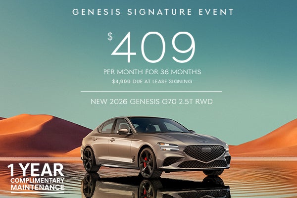 Ex: 2026 Genesis G70 2.5T RWD. VIN: KMTG24SCXTU168721. MSRP: $50,265. $409 per month lease for 36 months. With approved credit. 10,000 miles per year. $4,999 due at signing. Not all will qualify. On select models. Two available in stock. One year of complimentary maintenance includes one oil change and one tire rotation. Good on select new and used vehicles. See the dealer of complete maintenance details. Advertised Price EXCLUDES all optional dealer offered items, accessories, or product addendums optionally selected by the purchaser, applicable official taxes and fees, and a $436 documentary fee. See dealer for details. Offer Expires 3/31/26.