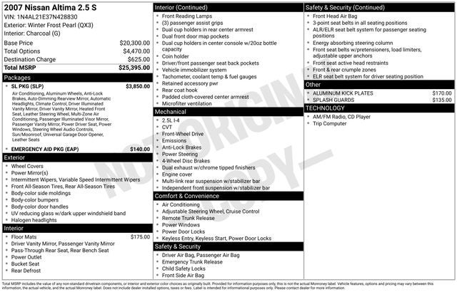 4-Spoke Leather-Wrapped Steering Wheel, 4-Wheel Disc Brakes, 6 Speakers, 7.0JJ x 16 Cast Aluminum Alloy Wheels, 7.0JJ x 16 Steel Wheels w/Bolt-On Cover, 8-Way Power Driver's Seat, Air Conditioning, Aluminum Kick Plates, AM/FM radio, AM/FM/CD Radio, Anti-Lock Braking System, Anti-whiplash front head restraints, Auto-Dimming Rear-View Mirror, Automatic On/Off Headlights, Bodyside moldings, Bumpers: body-color, Cargo Net, Carpeted Floor/Trunk Mat Set (5-Piece), CD player, Cloth Seat Trim, Compass, Contoured Reclining Front Bucket Seats, Delay-off headlights, Driver door bin, Driver vanity mirror, Driver's Power Lumbar Support, Dual front impact airbags, Dual front side impact airbags, Dual Sun Visors w/Illuminated Vanity Mirrors, Dual Zone Automatic Temperature Control, Emergency Aid Package, First Aid/Emergency Kit, Four wheel independent suspension, Front anti-roll bar, Front Bucket Seats, Front Center Armrest w/Storage, Front reading lights, Front-Passenger Power Window w/One-Touch Auto Up/Down, Heated Driver & Front-Passenger Seats, HomeLink Universal Transceiver, Illuminated entry, Key Fob-Operated Front Windows Up/Down, Leather Appointed Seats, Leather Wrapped Gearshift Knob, Low tire pressure warning, Occupant sensing airbag, Outside temperature display, Overhead airbag, Overhead console, Panic alarm, Passenger door bin, Passenger vanity mirror, Power door mirrors, Power Sliding Glass Moonroof w/Tilt Feature, Power steering, Power windows, Rear anti-roll bar, Rear seat center armrest, Rear window defroster, Rear-Passenger Air Conditioning Vents, Remote keyless entry, Security system, SL Package, Speed control, Speed-sensing steering, Speed-Sensitive Wipers, Splash Guards, Split folding rear seat, Steering Wheel-Mounted Audio Controls, Tachometer, Telescoping steering wheel, Tilt steering wheel, Trip computer, Upper-Grade Interior Finisher, Variably intermittent wipers.