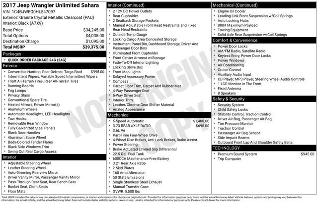 We understand that purchasing a vehicle is a significant decision, and we're here to ensure you have all the information you need to make an informed choice. I encourage you to schedule a test drive and experience the exceptional capabilities and comfort of this 2017 Jeep Wrangler Unlimited Sahara. Our knowledgeable sales team is ready to answer any questions you may have and guide you through the buying process.