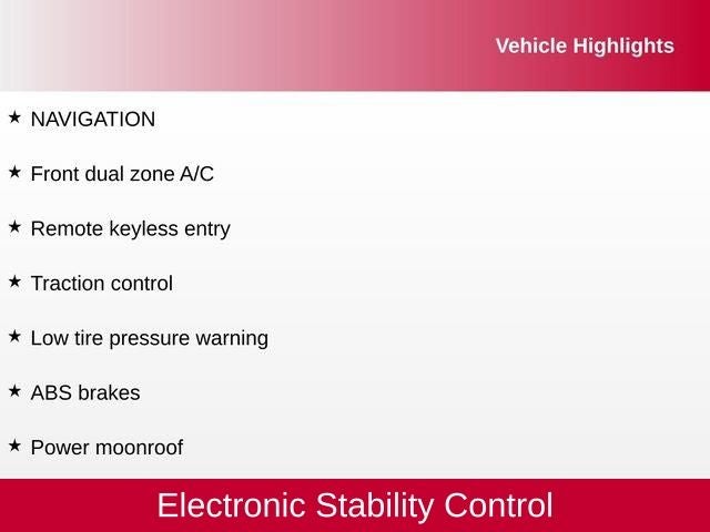 ABS brakes, Active Cruise Control, Alloy wheels, Compass, Electronic Stability Control, Front dual zone A/C, Heated door mirrors, HEATED FRONT SEATS, Illuminated entry, Low tire pressure warning, NAVIGATION, Power moonroof, Remote keyless entry, Traction control.