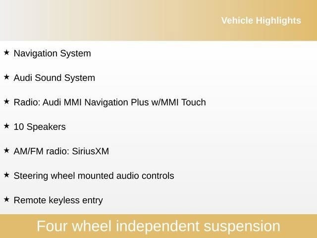 10 Speakers, AM/FM radio: SiriusXM, Audi Connect w/Online Services, Audi Sound System, Four wheel independent suspension, Heated Front Seats, Leather Seating Surfaces, Navigation System, Power door mirrors, Power driver seat, Power passenger seat, Radio: Audi MMI Navigation Plus w/MMI Touch, Remote keyless entry, Speed-sensing steering, Steering wheel mounted audio controls, USB Audi Music Interface, Wheels: 18 10-V-Spoke-Design, 4-Wheel Disc Brakes, ABS brakes, Air Conditioning, Alloy wheels, Anti-whiplash front head restraints, Auto-dimming door mirrors, Auto-dimming Rear-View mirror, Automatic temperature control, Brake assist, Bumpers: body-color, CD player, Compass, Delay-off headlights, Driver door bin, Driver vanity mirror, Dual front impact airbags, Dual front side impact airbags, Electronic Stability Control, Exterior Parking Camera Rear, Front anti-roll bar, Front Bucket Seats, Front Center Armrest w/Storage, Front dual zone A/C, Front fog lights, Front reading lights, Garage door transmitter: HomeLink, Genuine wood console insert, Genuine wood dashboard insert, Genuine wood door panel insert, Heated door mirrors, Heated front seats, High intensity discharge headlights: Bi-xenon, HVAC memory, Illuminated entry, Knee airbag, Leather Shift Knob, Leather steering wheel, Low tire pressure warning, Memory seat, Occupant sensing airbag, Outside temperature display, Overhead airbag, Panic alarm, Passenger door bin, Passenger vanity mirror, Power moonroof, Power steering, Power windows, Radio data system, Rain sensing wipers, Rear air conditioning, Rear anti-roll bar, Rear fog lights, Rear reading lights, Rear seat center armrest, Rear window defroster, Security system, Speed control, Speed-Sensitive Wipers, Split folding rear seat, Tachometer, Telescoping steering wheel, Tilt steering wheel, Traction control, Trip computer, Turn signal indicator mirrors, Variably intermittent wipers, 10 Speakers, AM/FM radio: SiriusXM, Audi Connect w/Online Services, Audi Sound System, Four wheel independent suspension, Heated Front Seats, Leather Seating Surfaces, Navigation System, Power door mirrors, Power driver seat, Power passenger seat, Radio: Audi MMI Navigation Plus w/MMI Touch, Remote keyless entry, Speed-sensing steering, Steering wheel mounted audio controls, USB Audi Music Interface, Wheels: 18 10-V-Spoke-Design.