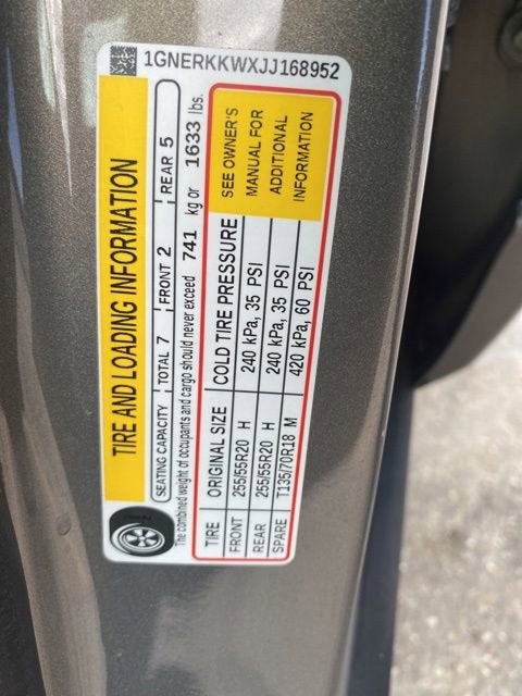 10 Speakers, 1st & 2nd Row All-Weather Floor Mats, 3.49 Axle Ratio, 3rd Row All-Weather Floor Mats, 3rd row seats: split-bench, 4-Wheel Disc Brakes, 7-Passenger Seating (2-2-3 Seating Configuration), ABS brakes, Air Conditioning, All-Weather Cargo Mat (LPO), Alloy wheels, AM/FM radio: SiriusXM, Apple CarPlay/Android Auto, Auto-dimming door mirrors, Auto-dimming Rear-View mirror, Automatic temperature control, Bose Premium 10-Speaker Audio System Feature, Brake assist, Bumpers: body-color, Compass, Delay-off headlights, Driver Confidence II Package, Driver door bin, Driver vanity mirror, Dual front impact airbags, Dual front side impact airbags, Dual SkyScape 2-Panel Power Sunroof, Electronic Stability Control, Emergency communication system: OnStar Guidance, Following Distance Indicator, Forward Collision Alert, Four wheel independent suspension, Front anti-roll bar, Front Bucket Seats, Front Center Armrest, Front dual zone A/C, Front fog lights, Front License Plate Bracket Mounting Package, Front Pedestrian Braking, Front reading lights, Fully automatic headlights, Garage door transmitter, Heated door mirrors, Heated front seats, Heated rear seats, Heated steering wheel, Heavy-Duty Cooling System, Illuminated entry, IntelliBeam Auto High Beam Control Headlamps, Interior Protection Package (LPO), Lane Keep Assist w/Lane Departure Warning, Low Speed Forward Automatic Braking, Low tire pressure warning, Memory seat, Navigation System, Occupant sensing airbag, Outside temperature display, Overhead airbag, Overhead console, Panic alarm, Passenger door bin, Passenger vanity mirror, Perforated Leather-Appointed Seat Trim, Power door mirrors, Power driver seat, Power Liftgate, Power passenger seat, Power steering, Power windows, Preferred Equipment Group 1LZ, Premium audio system: Chevrolet MyLink, Radio data system, Radio: Chevrolet MyLink AM/FM Stereo w/Navigation, Rear air conditioning, Rear anti-roll bar, Rear reading lights, Rear window defroster, Rear window wiper, Remote keyless entry, Roof Rack Cross Rails (LPO), Roof rack: rails only, Security system, SiriusXM Satellite Radio, Speed control, Speed-sensing steering, Spoiler, Steering wheel memory, Steering wheel mounted audio controls, Tachometer, Telescoping steering wheel, Tilt steering wheel, Traction control, Trailering Equipment, Trip computer, Turn signal indicator mirrors, Variably intermittent wipers, Ventilated front seats, Voltmeter, Wheels: 20 Argent Metallic Machine Faced Aluminum.