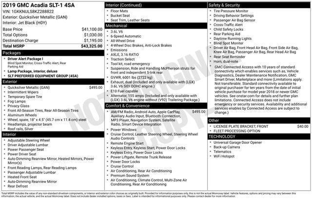 Quicksilver Metallic 2019 GMC Acadia SLT-1 AWD 6-Speed Automatic 3.6L V6 SIDI WE DELIVER ANYWHERE, Ford Blue Advantage Blue Certified Certified, AWD, Jet Black Leather, Preferred Equipment Group 4SA, 155 Amp Alternator, 18 x 7.5 Aluminum (4) Wheels, 3.16 Axle Ratio, 3rd row seats: split-bench, 4-Wheel Disc Brakes, 6-Passenger (2-2-2 Seating Configuration), 8 Speakers, 8-Way Power Front Passenger Seat Adjuster, ABS brakes, Air Conditioning, Alloy wheels, AM/FM radio: SiriusXM, Apple CarPlay/Android Auto, Auto-dimming door mirrors, Auto-dimming Rear-View mirror, Automatic temperature control, Bose Premium 8-Speaker System, Brake assist, Bumpers: body-color, Compass, Delay-off headlights, Driver door bin, Driver vanity mirror, Dual front impact airbags, Dual front side impact airbags, Electronic Stability Control, Emergency communication system: OnStar and GMC connected services capable, Exterior Parking Camera Rear, Four wheel independent suspension, Front anti-roll bar, Front Bucket Seats, Front Center Armrest, Front dual zone A/C, Front fog lights, Front License Plate Bracket, Front reading lights, Fully automatic headlights, Garage door transmitter, Heated door mirrors, Heated Driver & Front Passenger Seats, Heated front seats, Illuminated entry, Knee airbag, Low tire pressure warning, Occupant sensing airbag, Outside temperature display, Overhead airbag, Overhead console, Panic alarm, Passenger door bin, Passenger vanity mirror, Perforated Leather-Appointed Seat Trim, Power door mirrors, Power Driver Lumbar Control Seat Adjuster, Power driver seat, Power Liftgate, Power Passenger Lumbar Control Seat Adjuster, Power passenger seat, Power steering, Power windows, Premium audio system: GMC Infotainment System, Radio data system, Radio: AM/FM w/8 Diagonal Color Touch Screen, Radio: AM/FM w/8 Diagonal Color Touch Screen & Nav, Rear air conditioning, Rear anti-roll bar, Rear reading lights, Rear window defroster, Rear window wiper, Remote keyless entry, Roof rack: rails only, Security system, SiriusXM Radio, Speed control, Speed-sensing steering, Spoiler, Steering wheel mounted audio controls, Tachometer, Telescoping steering wheel, Tilt steering wheel, Traction control, Trip computer, Variably intermittent wipers, Voltmeter, AWD, Jet Black Leather, Preferred Equipment Group 4SA.