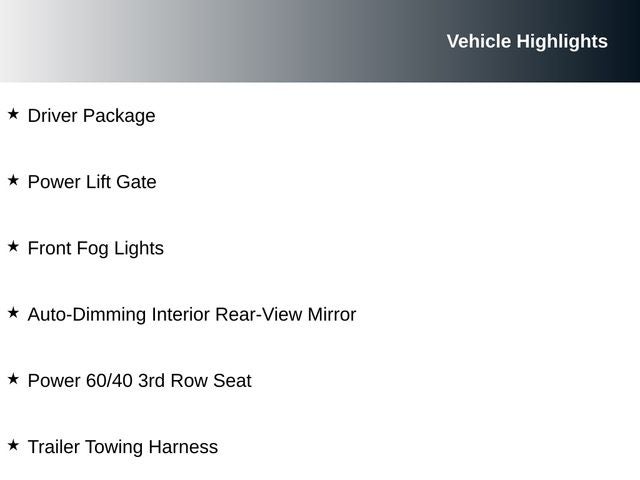 - Driver Package: Includes Auto-Dimming Interior Rear View Mirror, Universal Garage Door Opener, Power Liftgate, Trailer Towing Harness, Pre-Wire and Connector for Brake Controller, Power 60/40 3rd Row Seat, Front Fog Lights