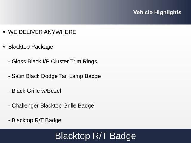 - Blacktop Package: Black Fuel Filler Door, Gloss Black I/P Cluster Trim Rings, Rear Black Spoiler, HEMI Blacktop Fender Badge, Satin Black Dodge Tail Lamp Badge, Blacktop R/T Badge, 20 Black Noise Painted Wheels, Black Grille with Bezel, Challenger Blacktop Grille Badge