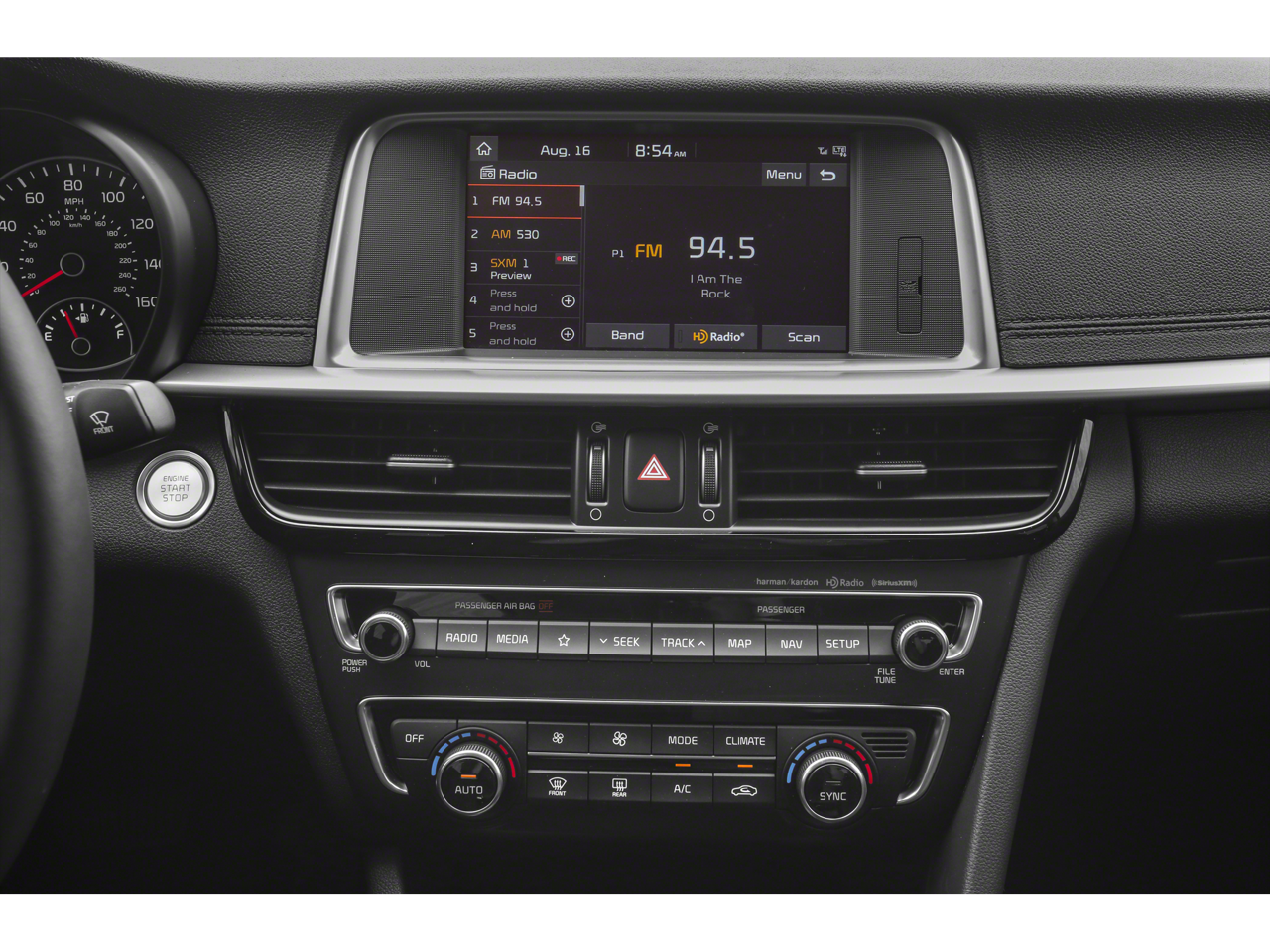 • Radio: harman/kardon AM/FM/MP3/SiriusXM Audio -inc: 630-watts, harman/kardon premium surround sound audio system, 10 speakers including subwoofer, external amplifier, QuantumLogic 7.1 channel surround playback, Clari-Fi digital audio restoration, 8" color touch-screen display, auxiliary input jack, 2 USB chargers, support for Android Auto and Apple CarPlay, Bluetooth® wireless technology w/voice recognition and UVO Link w/navigation