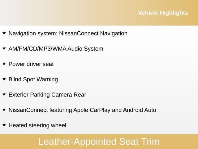 - Radio: AM/FM/CD/MP3/WMA Audio System -inc: Bose audio system w/11 speakers plus dual subwoofer, NissanConnect w/navigation featuring Apple CarPlay and Android Auto, Nissan door to door navigation w/3D building graphics and satellite imagery, connected navigation features including online POI search, door-to-door and online premium traffic information, HD Radio, SiriusXM Travel Link (weather, fuel prices, movie listings, stock info, sports and parking), SiriusXM Traffic, auxiliary audio input jack, SiriusXM satellite radio, 8" color display w/multi-touch control, 2 front illuminated USB connection ports (1 type-A, 1 type-C) for iPod interface and other compatible devices, Bluetooth® hands-free phone system, streaming audio via Bluetooth®, hands-free text-messaging assistant and 2 rear illuminated USB charge ports (1 type-A, 1 type-C)