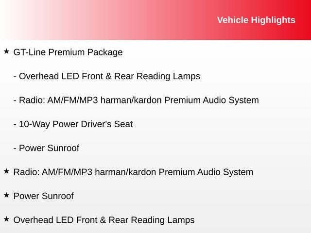 - GT-Line Premium Package, offering a power sunroof, overhead LED front and rear reading lamps, a 10-way power driver's seat, and a premium harman/kardon audio system.