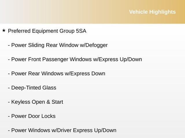 - Navigation System, Steering Wheel Audio Controls, Electric Rear-Window Defogger, Power Windows, Remote Vehicle Starter, Keyless Open & Start, Lane Departure Warning, Automatic Emergency Braking, HD Surround Vision, Wireless Charging, Heated & Ventilated Front Seats