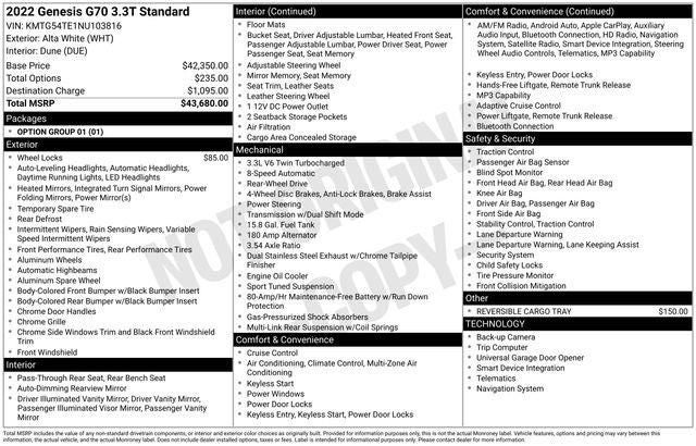 Discover the perfect balance of style, performance, and technology in this 2022 Genesis G70 3.3T. With a list price of $30,615, this exceptional vehicle represents exceptional value in the luxury sedan segment. We invite you to experience the exceptional craftsmanship and driving dynamics of the Genesis G70 firsthand. Schedule a test drive today and let us demonstrate why this sedan should be at the top of your consideration list.