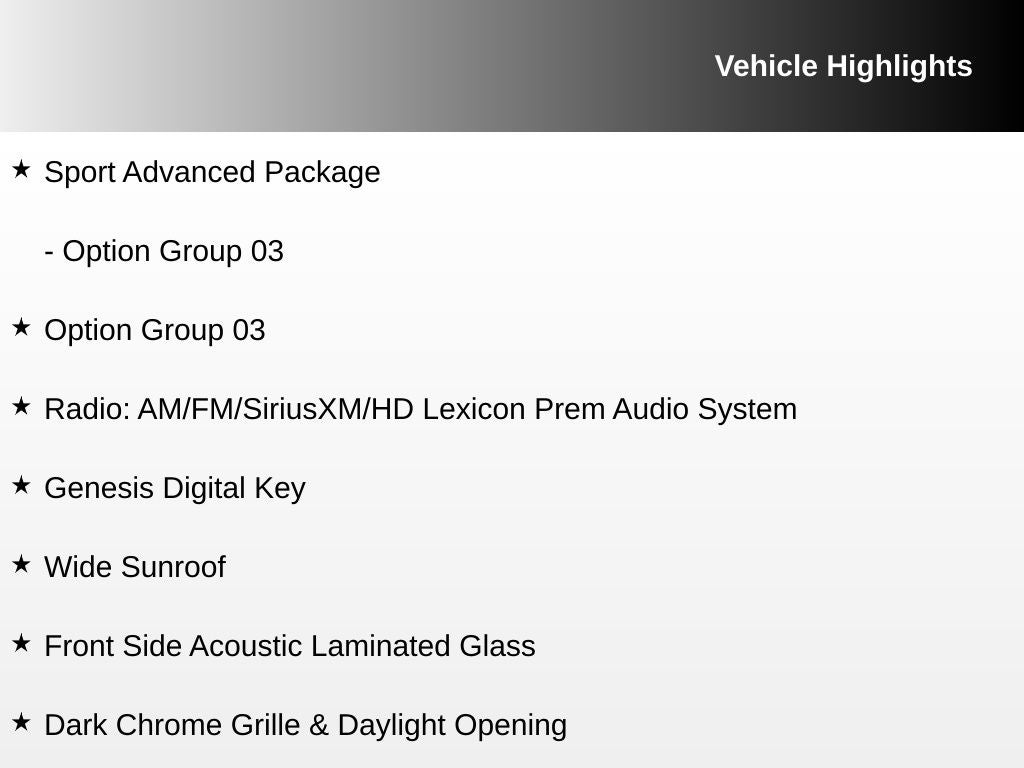 - Radio: AM/FM/SiriusXM/HD Audio System -inc: 6 speakers including subwoofer, 6 channel internal amplifier, speed-sensing auto volume control, 5th generation navigation system w/10.25" touchscreen, dynamic voice recognition, connected routing, over the air updates, Android Auto and Apple CarPlay, Bluetooth® hands-free phone system, steering wheel audio, cruise and phone controls, USB front and Genesis Connected Services