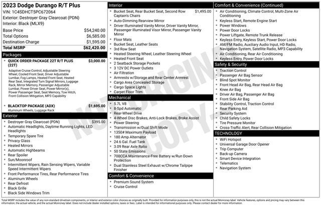 Safety and convenience are also at the forefront, with features such as Adaptive Cruise Control with Stop, Full Speed Forward Collision Warning Plus, and the ParkView Rear Back-Up Camera. The Durango R/T Plus also boasts a power liftgate and a 115V auxiliary power outlet, making it the perfect companion for your active lifestyle.