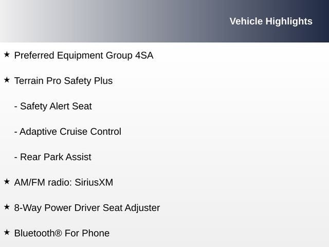 - TERRAIN PRO SAFETY PLUS package, including Adaptive Cruise Control, Safety Alert Seat, and Rear Park Assist