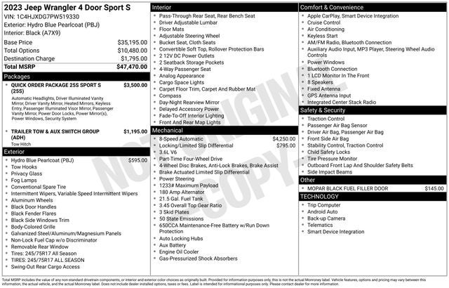 240 Amp Alternator, 3.45 Overall Top Gear Ratio, 4-Wheel Disc Brakes, 7 & 4 Pin Wiring Harness, 700 Amp Maintenance Free Battery, 8 Speakers, ABS brakes, Air Conditioning, AM/FM radio, Anti-Spin Differential Rear Axle, Apple CarPlay, Apple CarPlay/Android Auto, Automatic Headlamps, Aux Battery, Auxiliary Switches, Brake assist, Class II Receiver Hitch, Cloth Low-Back Bucket Seats, Compass, Deep Tint Sunscreen Windows, Delay-off headlights, Driver door bin, Driver vanity mirror, Dual front impact airbags, Dual front side impact airbags, Electronic Stability Control, Emergency communication system: SiriusXM Guardian, Engine Oil Cooler, Front 1-Touch Down Power Windows, Front anti-roll bar, Front Bucket Seats, Front Center Armrest w/Storage, Front fog lights, Front reading lights, Google Android Auto, GPS Antenna Input, Integrated Center Stack Radio, Integrated roll-over protection, Integrated Voice Command w/Bluetooth®, Low tire pressure warning, Mopar Black Fuel Filler Door, Non-Lock Fuel Cap w/o Discriminator, Normal Duty Suspension, Occupant sensing airbag, Outside temperature display, ParkView Rear Back-Up Camera, Passenger door bin, Passenger vanity mirror, Power Heated Mirrors, Power steering, Premium Wrapped Steering Wheel, Quick Order Package 25S Sport S, Radio data system, Radio: Uconnect 4 w/7 Display, Rear anti-roll bar, Rear reading lights, Remote Keyless Entry, Security Alarm, Speed control, Speed Sensitive Power Locks, Split folding rear seat, Sport S, Steering wheel mounted audio controls, Stop-Start Dual Battery System, Sun Visors w/Illuminated Vanity Mirrors, Tachometer, Telescoping steering wheel, Tilt steering wheel, Traction control, Trailer Tow & Aux Switch Group, Trip computer, USB Host Flip, Variably intermittent wipers, Wheels: 17 x 7.5 Tech Silver Aluminum, Wheels: 17 x 7.5 Black Steel Styled, Wheels: 17 x 7.5 Tech Silver Aluminum (DISC).
