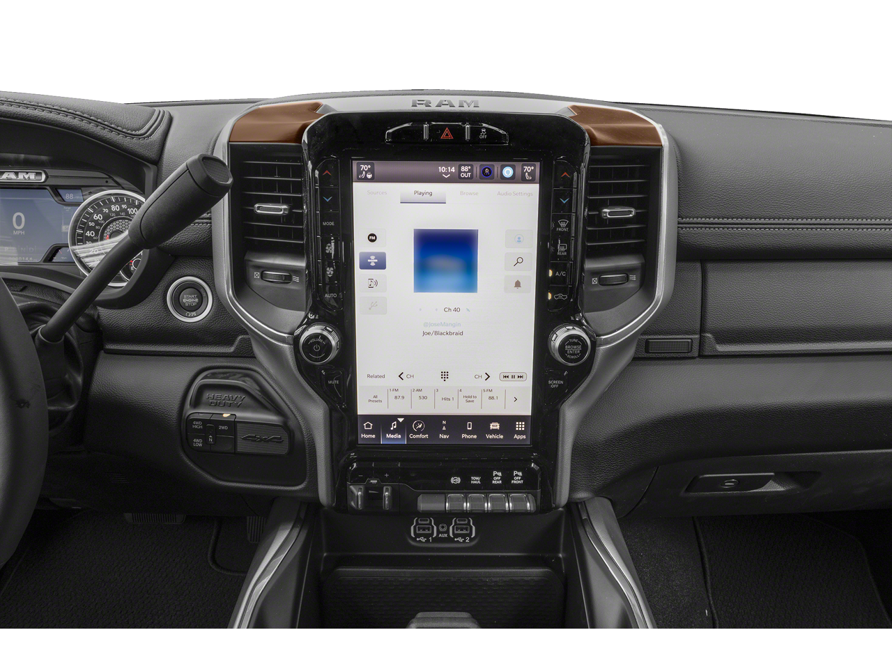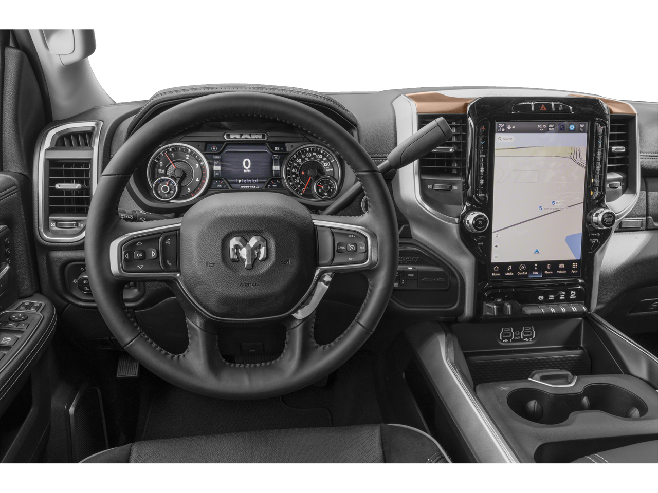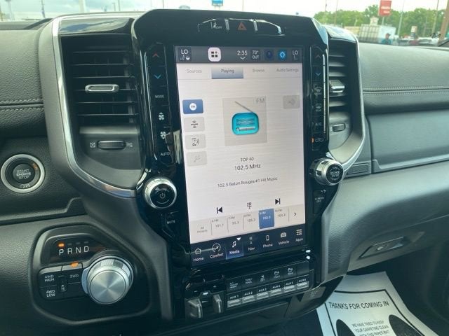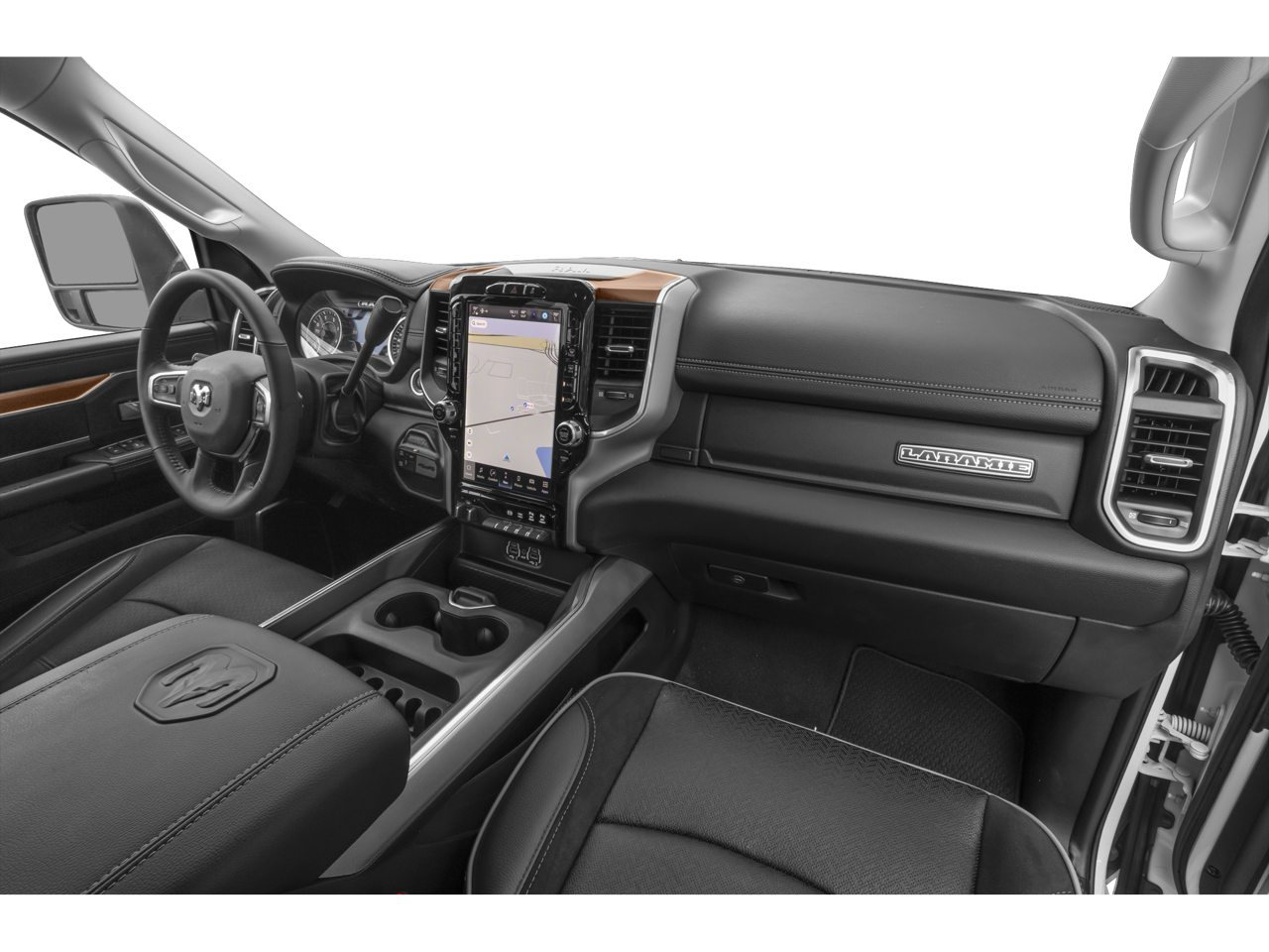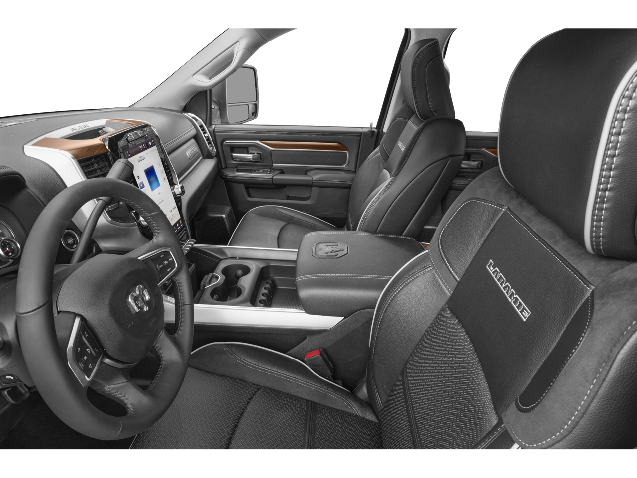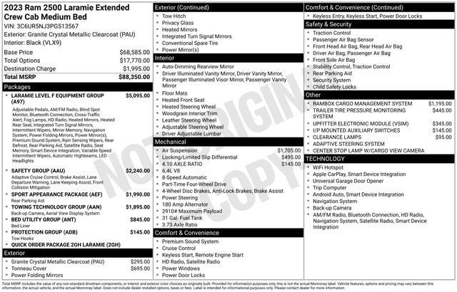 10 Speakers, 115V Auxiliary Rear Power Outlet, 12 Touchscreen Display, 17 Speaker harman/kardon Premium Sound, 2 Way Rear Headrest Seat, 4 Adjustable Cargo Tie-Down Hooks, 4 Way Front Headrests, 4-Wheel Disc Brakes, 4G LTE Wi-Fi Hot Spot, ABS brakes, Active Noise Control System, Adaptive Cruise Control w/Stop, Adaptive Steering System, Air Conditioning, Alexa Built-In, Alloy wheels, AM/FM radio: SiriusXM with 360L, Anti-Spin Differential Rear Axle, Apple CarPlay, Apple CarPlay/Android Auto, Auto Adjust In Reverse Exterior Mirrors, Auto Dim Exterior Mirror, Auto High Beam Headlamp Control, Auto Level Rear Air Suspension, Auto Power-Folding Mirrors, Auto-Dimming Exterior Passenger Mirror, Auto-dimming Rear-View mirror, Automatic temperature control, Bed Utility Group, Black Interior Accents, Blind Spot & Cross Path Detection, Body Color Grille Surround, Brake assist, Bumpers: body-color, Center Hub, Center Stop Lamp w/Cargo View Camera, Chrome Exterior Mirrors, Clearance Lamps, Compass, Connected Travel & Traffic Services, Connectivity - US/Canada, Dash Pass Thru Wire Circuits, Delay-off headlights, Disassociated Touchscreen Display, Driver door bin, Driver vanity mirror, Dual front impact airbags, Dual front side impact airbags, Electronic Stability Control, Electronically Controlled Throttle, Exterior Mirrors Courtesy Lamps, Exterior Mirrors w/Heating Element, Exterior Mirrors w/Memory, Exterior Mirrors w/Supplemental Signals, Foam Bottle Insert (Door Trim Panel), For Details, Visit DriveUconnect.com, For More Info, Call 800-643-2112, Forward & Reverse Utility Lights, Front anti-roll bar, Front Center Armrest w/Storage, Front dual zone A/C, Front LED Fog Lamps, Front reading lights, Front Seat Back Map Pockets, Full Speed Forward Collision Warning Plus, Fully automatic headlights, Garage door transmitter, Global Telematics Box Module (TBM), Google Android Auto, GPS Antenna Input, GPS Navigation, HD Radio, Heated door mirrors, Heated Front Seats, Heated front seats, Heated Second Row Seats, Heated Steering Wheel, Heated steering wheel, High Back Seats, I/P Mounted Auxiliary Switches, Illuminated entry, Integrated Voice Command w/Bluetooth®, Lane Keep Assist, Laramie Level F Equipment Group, Leather steering wheel, Leather Trim 40/20/40 Bench Seat, LED Bed Lighting, LED Reflector Headlamps, Low tire pressure warning, Mirror Power Heat Fold Memory Tele, Mirror Running Lights, MOPAR Deployable Bed Step, MOPAR Spray In Bedliner, Navigation System, Occupant sensing airbag, Off-Road Information Pages, Outside temperature display, Overhead airbag, Overhead console, Panic alarm, ParkSense Front/Rear Park Assist System, ParkView Rear Back-Up Camera, Passenger door bin, Passenger vanity mirror, Power 2-Way Driver Lumbar Adjust, Power 2-Way Passenger Lumbar Adjust, Power Adjust 8-Way Driver Seat, Power Adjust 8-Way Front Passenger Seat, Power Adjust Mirrors, Power Adjustable Convex Aux Mirrors, Power Adjustable Pedals w/Memory, Power door mirrors, Power driver seat, Power passenger seat, Power steering, Power Telescoping Mirrors, Power windows, Protection Group, Quick Order Package 2GH Laramie, Radio data system, Radio: Uconnect 5 Nav w/12.0 Display, Radio: Uconnect 5 Nav w/8.4 Display, Radio/Driver Seat/Mirrors/Pedals Memory, Rain Sensitive Windshield Wipers, RamBox Cargo Management System, Rear 60/40 Folding Seat, Rear anti-roll bar, Rear Power Sliding Window, Rear reading lights, Rear seat center armrest, Rear step bumper, Rear Window Defroster, Remote keyless entry, Remote Tailgate Release, Safety Group, Security system, Selectable Tire Fill Alert, SiriusXM Radio Service, SiriusXM w/360L, Speed control, Split folding rear seat, Sport Appearance Package, Sport Decal, Sport Performance Hood, Steering wheel mounted audio controls, Surround View Camera System, Tachom