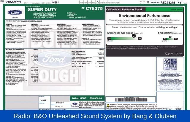 Race Red 2024 Ford F-250SD Lariat 4WD 10-Speed Automatic 6.7L High Output Power Stroke V8 Diesel 4WD, ABS brakes, Alloy wheels, Compass, Electronic Stability Control, Front dual zone A/C, Heated door mirrors, Heated front seats, Heated rear seats, Illuminated entry, Low tire pressure warning, Remote keyless entry, Traction control.