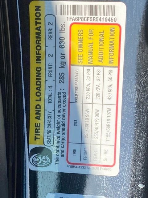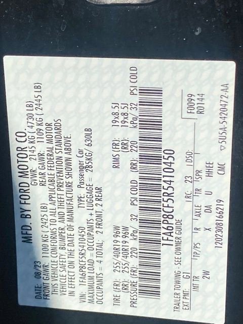 3.55 Limited Slip Rear Axle, 4-Wheel Disc Brakes, ABS brakes, Active Valve Performance Exhaust, Air Conditioning, Alloy wheels, AM/FM Stereo, Auto High-beam Headlights, Automatic temperature control, Brake assist, Bumpers: body-color, Compass, Delay-off headlights, Driver door bin, Driver vanity mirror, Dual front impact airbags, Dual front side impact airbags, Electronic Stability Control, Emergency communication system: 911 Assist, Equipment Group 301A High Package, Exterior Parking Camera Rear, Four wheel independent suspension, Front anti-roll bar, Front Bucket Seats, Front Center Armrest, Front reading lights, Fully automatic headlights, Headlamps w/Black Bezels, Illuminated entry, Knee airbag, Leather Shift Knob, Leather steering wheel, Low tire pressure warning, Mustang Nite Pony Package, Occupant sensing airbag, Outside temperature display, Overhead airbag, Overhead console, Painted Black Roof, Panic alarm, Passenger door bin, Passenger vanity mirror, Power door mirrors, Power steering, Power windows, Premium Floor Liners Front & Rear, Radio data system, Rain sensing wipers, Rear anti-roll bar, Rear Parking Sensors, Rear window defroster, Remote keyless entry, Speed control, Speed-sensing steering, Speed-Sensitive Wipers, Split folding rear seat, Spoiler, Sport steering wheel, Steering wheel mounted audio controls, SYNC 4.0 QNX, Tachometer, Telescoping steering wheel, Tilt steering wheel, Traction control, Trip computer, Variably intermittent wipers, Voltmeter, Wheels: 19 x 8.5 Ebony Black-Painted Aluminum.