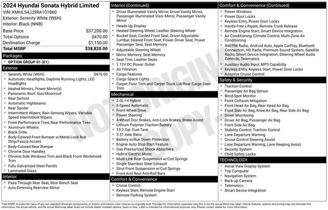 CARFAX One-Owner. Clean CARFAX. Priced below KBB Fair Purchase Price! Onyx Black 2024 Hyundai Sonata Hybrid Limited FWD 6-Speed Automatic with Shiftronic I4 12 Speakers, 17 x 7.0J Aluminum Alloy Wheels, 4-Wheel Disc Brakes, ABS brakes, Air Conditioning, Alloy wheels, AM/FM radio: SiriusXM, Apple CarPlay & Android Auto, Auto High-beam Headlights, Auto-dimming Rear-View mirror, Automatic temperature control, Brake assist, Bumpers: body-color, Delay-off headlights, Driver door bin, Driver vanity mirror, Dual front impact airbags, Dual front side impact airbags, Electronic Stability Control, Emergency communication system: Bluelink, Four wheel independent suspension, Front anti-roll bar, Front Bucket Seats, Front Center Armrest, Front dual zone A/C, Front reading lights, Fully automatic headlights, Heads-Up Display, Heated & Ventilated Front Bucket Seats, Heated door mirrors, Heated front seats, Heated steering wheel, Illuminated entry, Knee airbag, Lane Departure Warning System, Leather Seating Surfaces, Leather steering wheel, Low tire pressure warning, Memory seat, Navigation System, Occupant sensing airbag, Option Group 01, Outside temperature display, Overhead airbag, Overhead console, Panic alarm, Passenger door bin, Passenger vanity mirror, Power door mirrors, Power driver seat, Power moonroof, Power passenger seat, Power steering, Power windows, Radio data system, Radio: AM/FM/HD/SiriusXM, Rain sensing wipers, Rear anti-roll bar, Rear seat center armrest, Rear side impact airbag, Rear window defroster, Remote keyless entry, Security system, Speed control, Speed-sensing steering, Speed-Sensitive Wipers, Split folding rear seat, Spoiler, Steering wheel mounted audio controls, Tachometer, Telescoping steering wheel, Tilt steering wheel, Traction control, Trip computer, Variably intermittent wipers, Ventilated front seats.