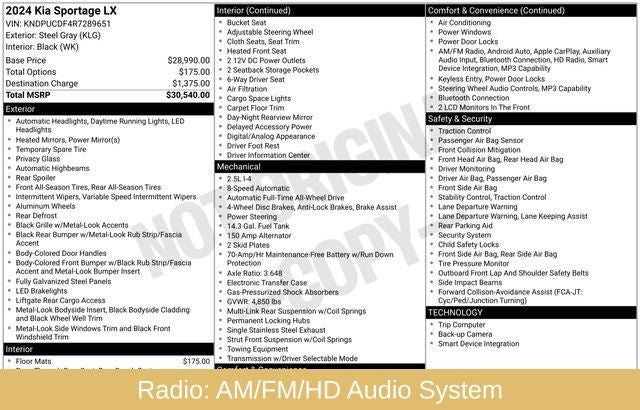 Under the hood, this Sportage LX is powered by a robust I4 engine paired with an 8-Speed Automatic transmission and All-Wheel Drive, delivering a responsive and efficient performance. With an impressive 23 city MPG and 26 highway MPG, you'll enjoy the perfect balance of power and fuel economy.