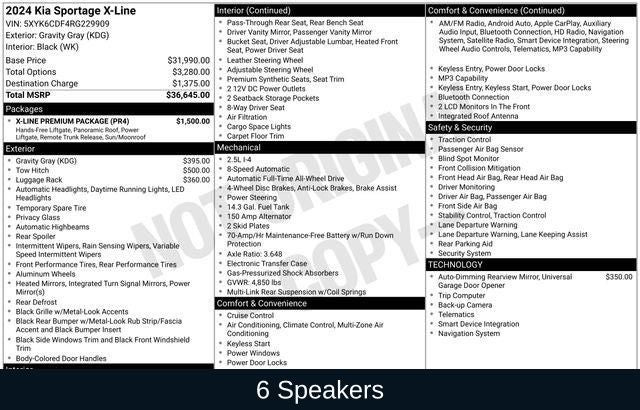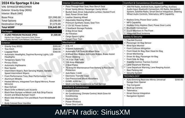 Priced below KBB Fair Purchase Price! Gravity Gray 2024 Kia Sportage X-Line AWD 8-Speed Automatic I4 6 Speakers, Alloy wheels, AM/FM radio: SiriusXM, Apple CarPlay & Android Auto, Auto High-beam Headlights, Automatic temperature control, Cross Bars X-Line, EC Mirror w/HomeLink, Emergency communication system, Fully automatic headlights, Heated door mirrors, Heated Front Bucket Seats, Heated front seats, Illuminated entry, Leather steering wheel, LED Interior Lighting, Navigation System, Panic alarm, Panoramic Sunroof, Premium Leatherette Seat Trim, Radio: AM/FM/HD Audio System, Rain sensing wipers, Remote keyless entry, Security system, Smart Power Liftgate, Steering wheel mounted audio controls, Tow Hitch w/Harness, Wheels: 19 Gloss Black Alloy, X-Line Premium Package.