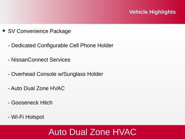 120V/12V Outlets In Back Of Center Console, 2 Illuminated USB-A Ports In Back Of Center Console, 20 Painted Alloy Wheels, Auto Dual Zone HVAC, Auto-Dimming Rear-View Mirror, Dedicated Configurable Cell Phone Holder, Dual Illuminated Vanity Mirrors, Front & Rear Parking Sensors, Gooseneck Hitch, Heated Front Captain's Chairs, Intelligent Key System, Leather-Wrapped Steering Wheel, LED Mood Light, NissanConnect Services, Overhead Console w/Sunglass Holder, Power Sliding Rear Window w/Defogger, Proximity Activation, Rear HVAC Vents, SV Convenience Package, Wi-Fi Hotspot, 17 x 7.5 Styled Steel Wheels, 4-Wheel Disc Brakes, 4.083 Axle Ratio, 6 Speakers, ABS brakes, Air Conditioning, AM/FM radio: SiriusXM, Auto High-beam Headlights, Blind Spot Warning, Brake assist, Bumpers: chrome, Carpet Floor Mats, Cloth Seat Trim, Driver door bin, Dual front impact airbags, Dual front side impact airbags, Electronic Stability Control, Front anti-roll bar, Front Center Armrest w/Storage, Front Manual Split Bench Seat (40/20/40), Front reading lights, Front wheel independent suspension, Fully automatic headlights, Heated door mirrors, Illuminated entry, Knee airbag, Low tire pressure warning, NissanConnect featuring Apple CarPlay and Android Auto, Occupant sensing airbag, Outside temperature display, Overhead airbag, Overhead console, Panic alarm, Passenger door bin, Passenger vanity mirror, Power door mirrors, Power steering, Power windows, Radio data system, Radio: NissanConnect AM/FM, Rear anti-roll bar, Rear Parking Sensors, Rear seat center armrest, Rear step bumper, Rear window defroster, Remote keyless entry, Security system, Speed control, Speed-sensing steering, Speed-Sensitive Wipers, Splash Guards, Split folding rear seat, Steering wheel mounted audio controls, Tachometer, Telescoping steering wheel, Tilt steering wheel, Traction control, Turn signal indicator mirrors, Variably intermittent wipers, Voltmeter, 120V/12V Outlets In Back Of Center Console, 2 Illuminated USB-A Ports In Back Of Center Console, 20 Painted Alloy Wheels, Auto Dual Zone HVAC, Auto-Dimming Rear-View Mirror, Dedicated Configurable Cell Phone Holder, Dual Illuminated Vanity Mirrors, Front & Rear Parking Sensors, Gooseneck Hitch, Heated Front Captain's Chairs, Intelligent Key System, Leather-Wrapped Steering Wheel, LED Mood Light, NissanConnect Services, Overhead Console w/Sunglass Holder, Power Sliding Rear Window w/Defogger, Proximity Activation, Rear HVAC Vents, SV Convenience Package, Wi-Fi Hotspot.