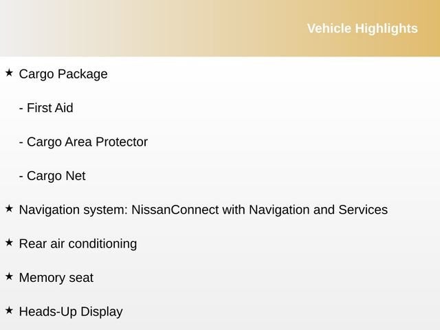 - NissanConnect w/Navigation & Services -inc: door to door connected navigation w/3D building graphics, satellite imagery, online POI search, online premium traffic information and SiriusXM Traffic and Travel Link w/weather, fuel prices, movie listings, stock info, sports and parking