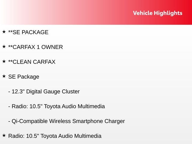The attention to detail is evident in the sleek and modern exterior design, featuring a body-color spoiler and 18 alloy wheels with a graphite-colored finish. Step inside and experience the comfort and style of the SE Package, which includes premium features like the Qi-Compatible Wireless Smartphone Charger, 12.3 Digital Gauge Cluster, and the advanced 10.5 Toyota Audio Multimedia system.